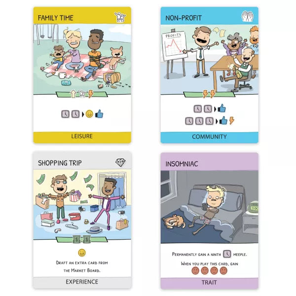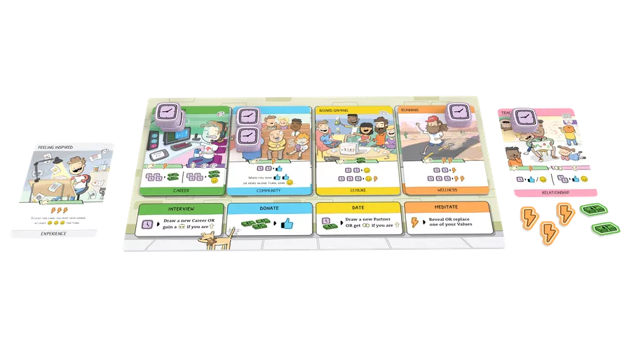 Each turn, players have to choose how to spend their Time, Energy, and Money to maximize their personal Happiness and positive Impact. Spend Time and Energy on your Career to get Money. Seek out Experiences to gain resources and Happiness, spend Time on Health to maximize the benefits of your other efforts, and find a partner to build a relationship with!