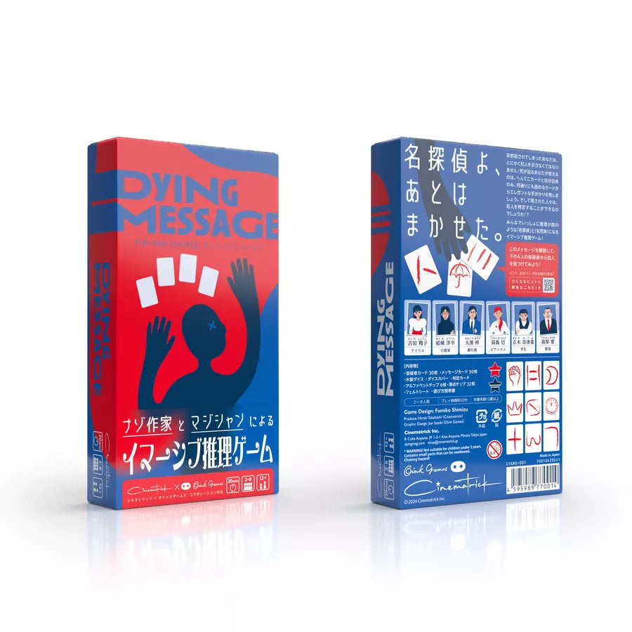 Customer Support407-951-5822You've been murdered! Well, almost, you're not dead yet, so you want to communicate the identity of who the killer is, but you have a limited number of tools to make that happen: a small number of cards with obscure marks on them and...yourself. Yes, your dying body. Maybe you can arrange the cards in some manner to convey information. Maybe your still fingers can point to — or obscure — parts of the cards to increase the clarity of your dying thought.