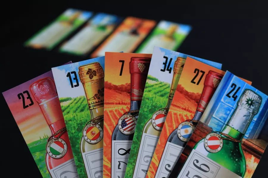 Over the course of eight rounds in Wine Cellar, players will collect wine bottles to create a cellar for their client. Bottles will be arranged to create a timeline for the order in which the wine will be consumed. Each bottle is worth different amounts based upon where it is in the timeline. Players will also receive points based on their client's preferences for wine type and country of origin.