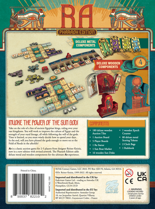 One of Reiner Knizia’s most loved games, RA is a classic auction game for 2-5 players, now in a new edition with revised artwork and deluxe components.
