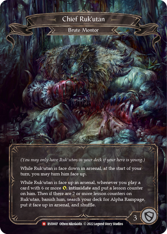 While Ruk'utan is face down in arsenal, at the start of your turn, you may turn him face up. While Ruk'utan is face up in arsenal, whenever you play a card with 6 or more {p}, intimidate and put a lesson counter on him. Then if there are 2 or more lesson counters on Ruk'utan, banish him, search your deck for Alpha Rampage, put it face up in arsenal, and shuffle.
