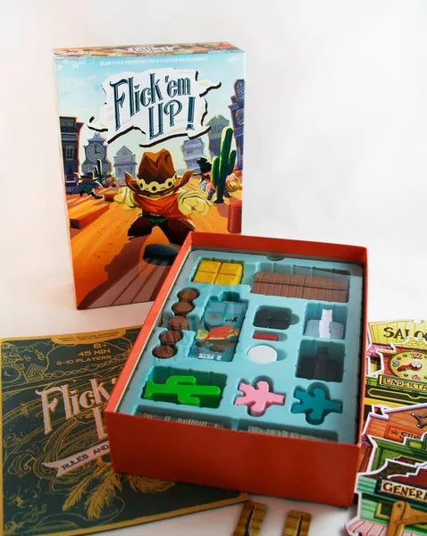 The cities in the West are not the safest place to be. In the disc-flicking game Flick 'em Up!, you can become an outlaw and rob banks, free prisoners, attack innocent bystanders... or you could become the Sheriff and try to protect the people of your city from these bandits!
