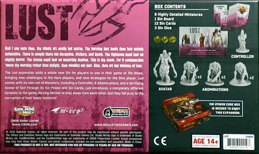 The Lust Expansion box comes with Avatar, Controller, 6 Abominations, Sin board and 12 sin cards.
