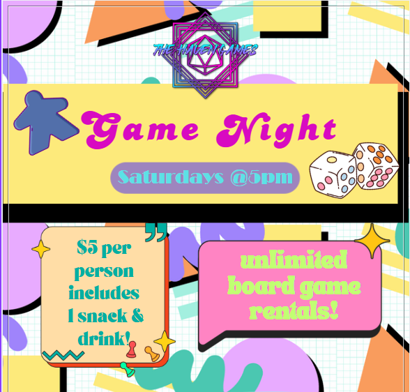 Bring your friends and family every Saturday for our Game Nights! $5 per person gets you unlimited board game rentals as well as 1 snack & drink  per ticket. Every Saturday starting July 5th, come on down to the Haven for some board game fun and madness :)