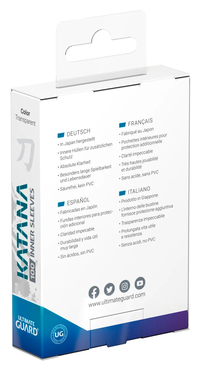 Katana Inner Sleeves are premium inner sleeves for additional card protection. Designed for standard-size trading cards (Magic: The Gathering, Pokémon, Lorcana, One Piece, Flesh and Blood, etc.), they are optimized to fit inside Ultimate Guard Katana Sleeves and Cortex Sleeves*. Katana Inner Sleeves offer an outstanding double-sleeving experience and impeccable clarity.