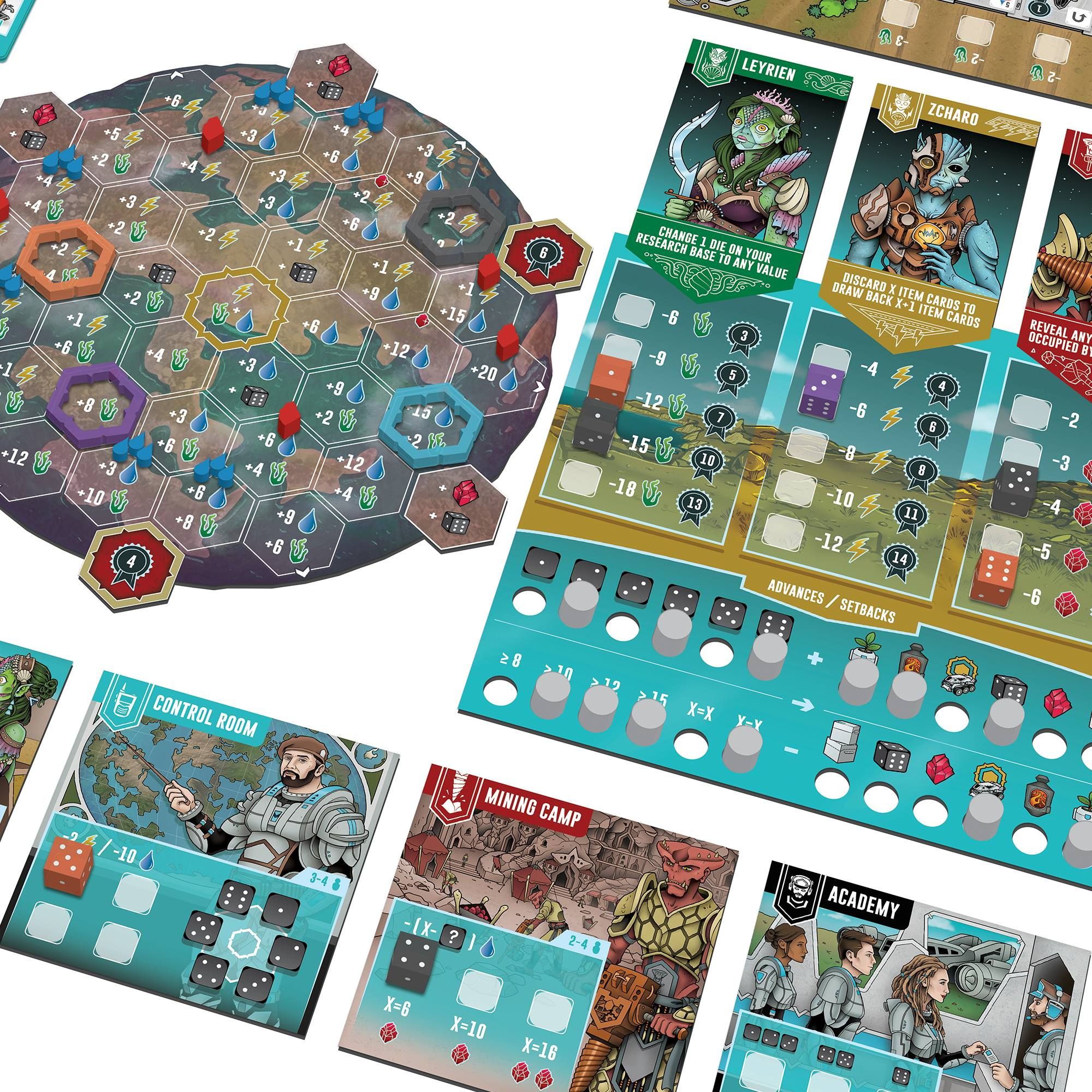 The aim of Circadians: First Light is to lead a team of researchers on the planet of Ryh. Players need to manage their crew (dice) to visit various parts of the planet for trade, farming, construction and research. Players score points for negotiating with the locals, harvesting resources for the depository, upgrading their research base, exploring the planet, and collecting gems. The game is played over eight rounds. At the end of the final round, the player with the most points wins.