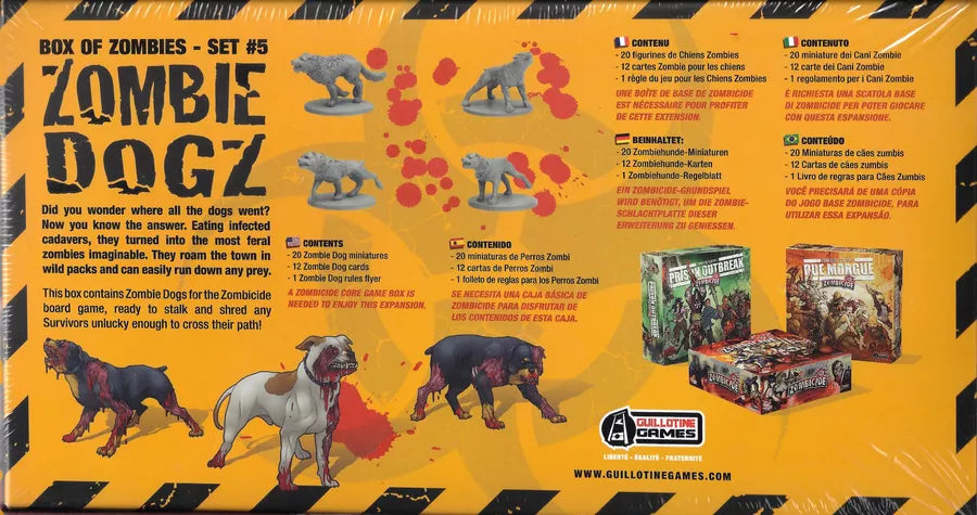 Customer Support407-951-5822This box of Zombie Dogz includes 20 miniatures and the cards to add to the zombie deck of any existing Zombicide base game.